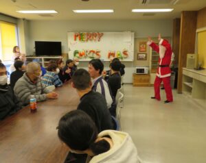 途中サンタさんも来てくれたり、職員さんの出し物を楽しんだりと皆さん大盛り上がりでした!!
